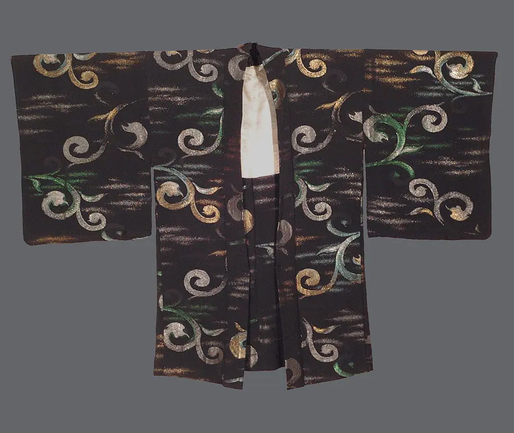 This black silk haori showcases a karakusa (arabesque) pattern woven with metallic threads and features one mon. It's in excellent condition, measuring 49 inches (124 cm) from sleeve-end to sleeve-end and standing at 32 inches (81 cm) tall.