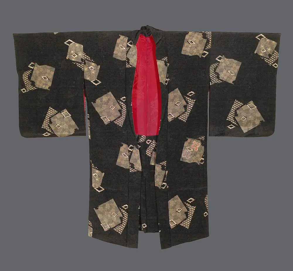 This silk haori is a sophisticated example of mid-century textile artistry, utilizing a diverse range of decorative techniques to create a rhythmic and textured composition. The garment is rendered on a deep black silk ground with a rinzu (damask) weave, providing a lustrous architectural field for its high-contrast surface decoration.