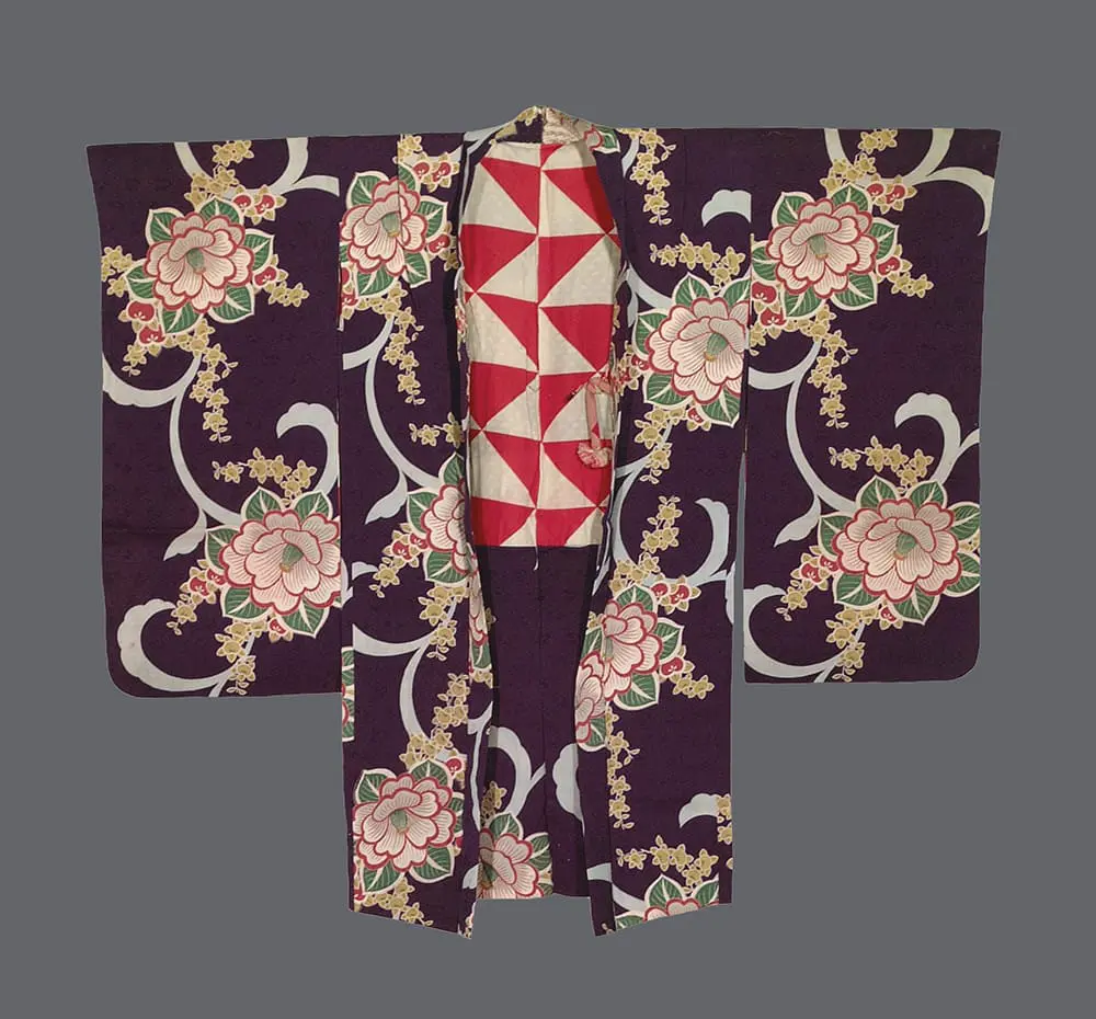 This silk haori is a visually striking example of textile design, utilizing the era's preference for bold scale and saturated colors to create a modern botanical statement. The garment is rendered on a deep purple ground, providing a regal architectural field for its high-contrast silkscreened decoration.