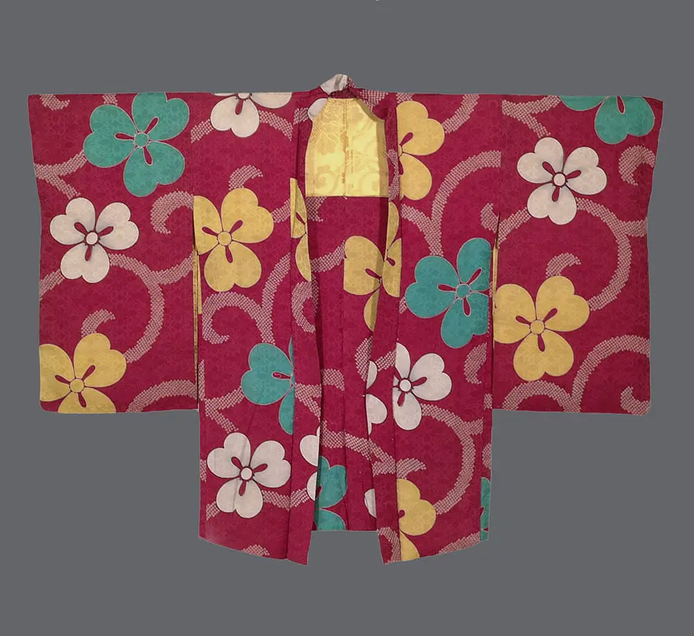 This rinzu silk haori features stylized cherry blossoms (sakura) rendered in a vibrant palette of sage green, golden yellow, and cream against a rich burgundy damask ground, with flowing ribbon-like elements that create dynamic movement across the surface. The combination of kata-yuzen stencil dyeing for the floral motifs and silkscreening to simulate kanoko shibori dots demonstrates the period's embrace of hybrid techniques that could achieve the aesthetic effects of labor-intensive traditional methods while meeting the demands of increased textile production during Japan's rapid modernization.