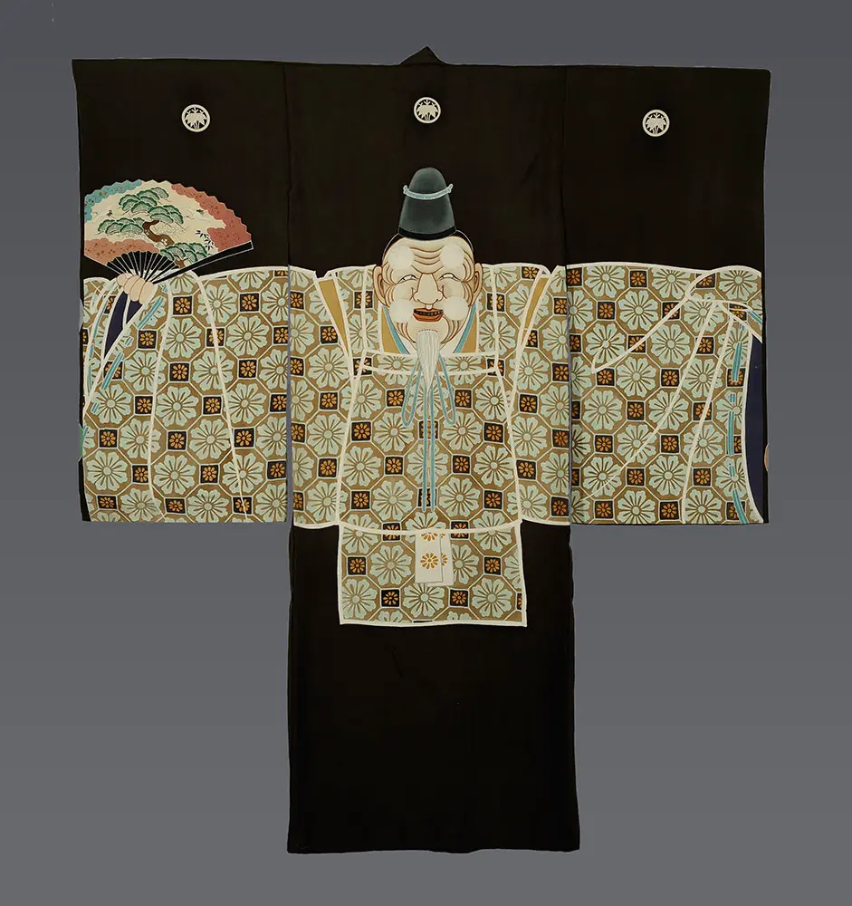 In this kimono's portrayal of the 'Sambaso', the Noh actor carries a fan displaying finely-rendered auspicious motifs symbolizing good luck, prosperity, and longevity for the child it was created for. The family crest motifs on the front include symbols like 'bamboo', 'mist', 'cloves', 'triple pestle', 'umbrella', 'stripes', 'tomoe', 'turnip', 'star', and 'crossed sickles', indicating wealth and a lineage associated with warrior families. These motifs held significant martial and noble connotations, depicting a wealthy military family.