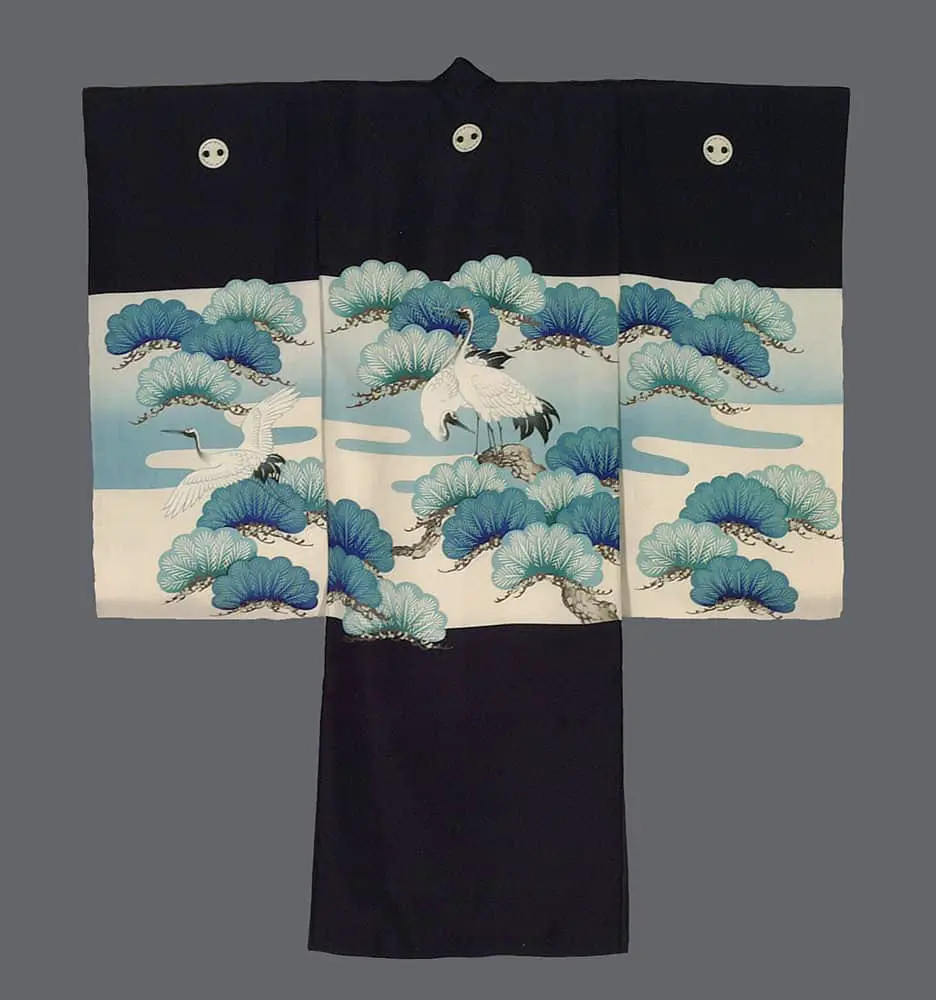 This silk miyamairi kimono, worn during Shinto baptism ceremonies, displays silk-screened auspicious motifs of cranes and pine trees. Despite minor imperfections, it remains in very good condition. Its measurements are 31 inches (79 cm) from sleeve-end to sleeve-end and stands at 36 inches (91 cm) in height.