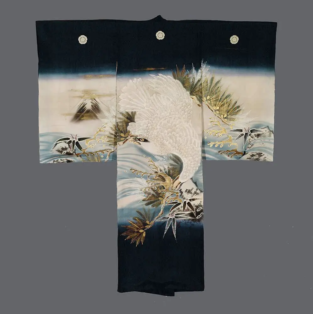 This silk miyamairi kimono, worn for ceremonial anointment at a Shinto shrine, showcases a large hand-painted white hawk. It remains in very good condition with only minor imperfections, measuring approximately 40 inches from sleeve-end to sleeve-end and standing 40 inches tall (102 cm x 102 cm).