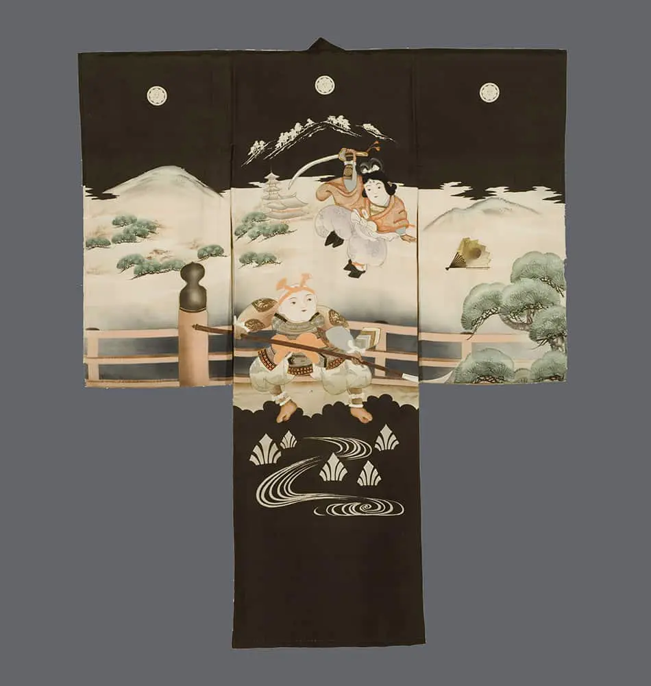 By placing legendary heroes onto a ceremonial kimono for boys, the textile draws upon cultural symbolism tied to courage, loyalty, and perseverance. The scene not only connects the wearer to Japan’s heroic past but also frames the child’s initiation into society with ideals of valor and destiny, reinforcing the significance of the Shinto coming-of-age rite.