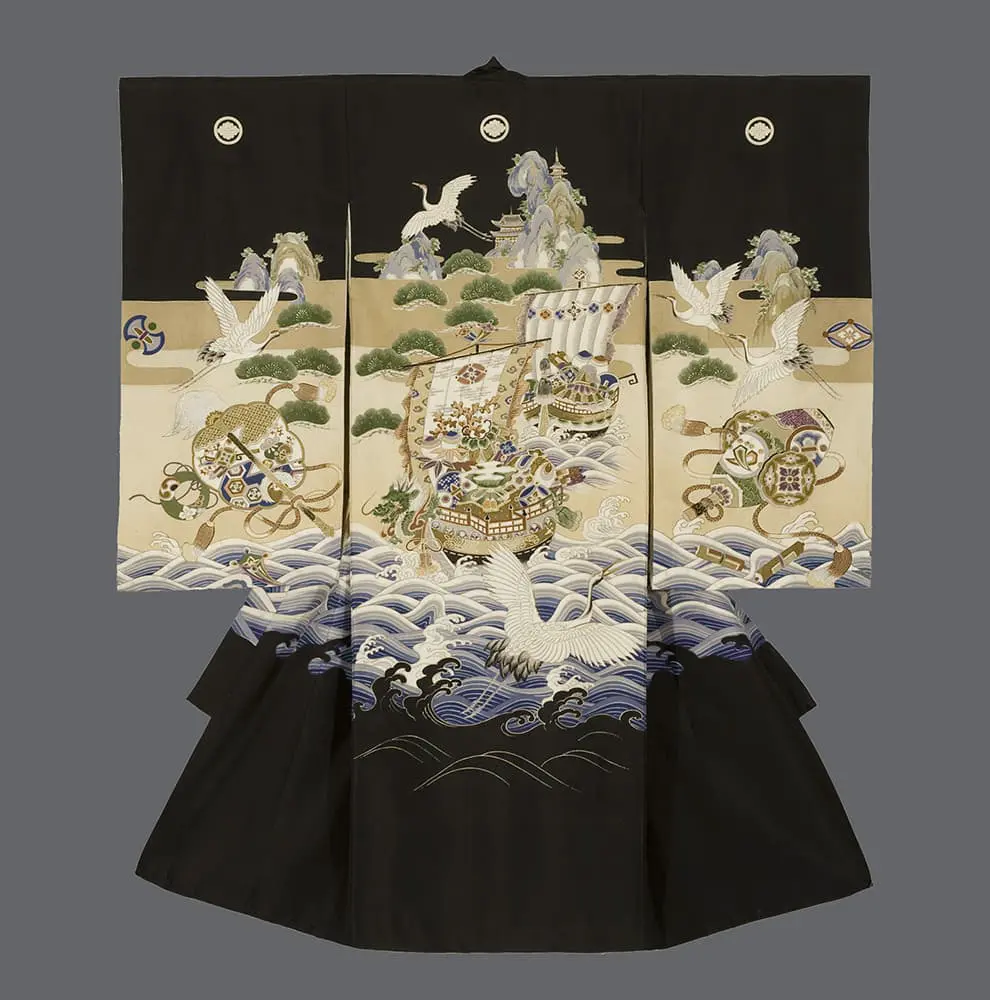 This silk miyamairi kimono, tailored for a ceremonial Shinto shrine blessing, showcases two silk-screened treasure ships outlined with gild foil and accented with metallic embroidery. It remains in very good condition, displaying only minor imperfections. Its measurements are 33 inches (84 cm) from sleeve-end to sleeve-end and 39 inches (99 cm) in height.
