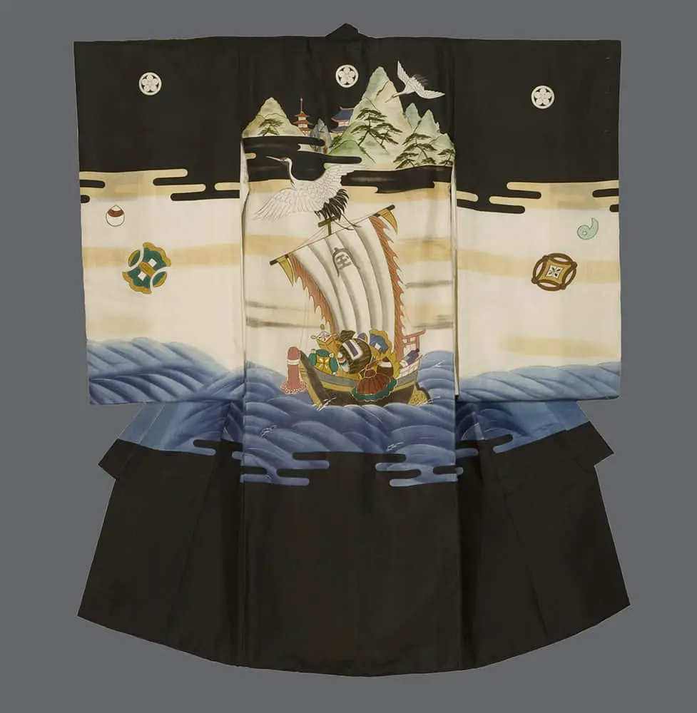 This silk miyamairi kimono, crafted for a ceremonial Shinto shrine blessing, features hand-painted motifs, notably a treasure ship. The design incorporates metallic couching and embroidery highlights. It measures 33 inches (84 cm) from sleeve-end to sleeve-end and stands at 37 inches (94 cm) in height.