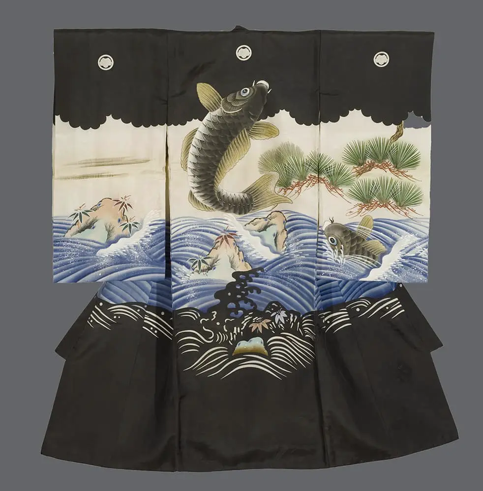 The artistic execution reflects the sophisticated integration of traditional Japanese painting methods with textile arts, where the fluid brushwork characteristic of sumi-e creates movement and vitality within the aquatic scene. The color palette moves from the deep charcoal tones of the upper section to brilliant blues representing water, with touches of green in the pine foliage and golden accents on the fish scales. The lower portion of the kimono features bold geometric wave patterns in white against the dark silk, creating a striking contrast that emphasizes the ceremonial nature of the garment.