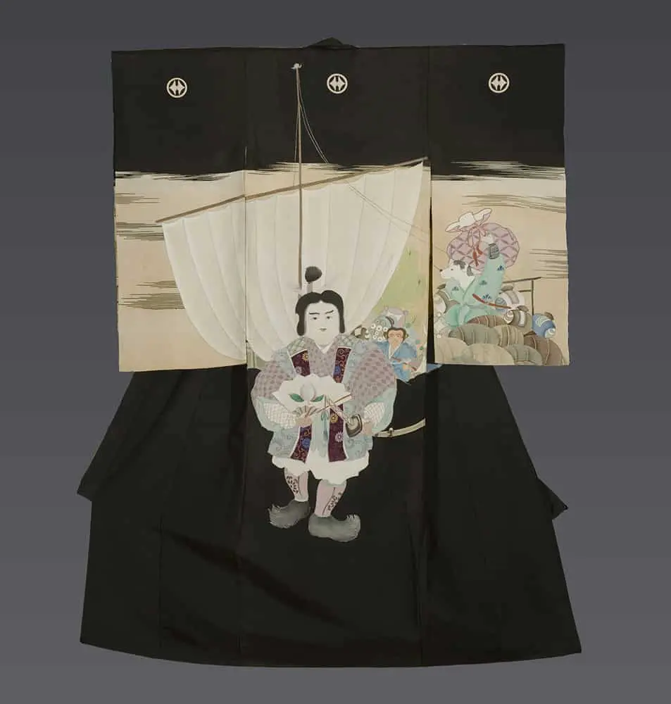 This ceremonial boy's kimono depicts the legendary Momotaro (Peach Boy) embarking on his heroic journey, accompanied by his faithful animal companions - the dog and monkey - who would later be joined by a pheasant in the complete tale. The composition is masterfully arranged to create a sense of adventure and movement, with the characters positioned as if caught in the midst of their quest to defeat the oni (demons) of Onigashima.