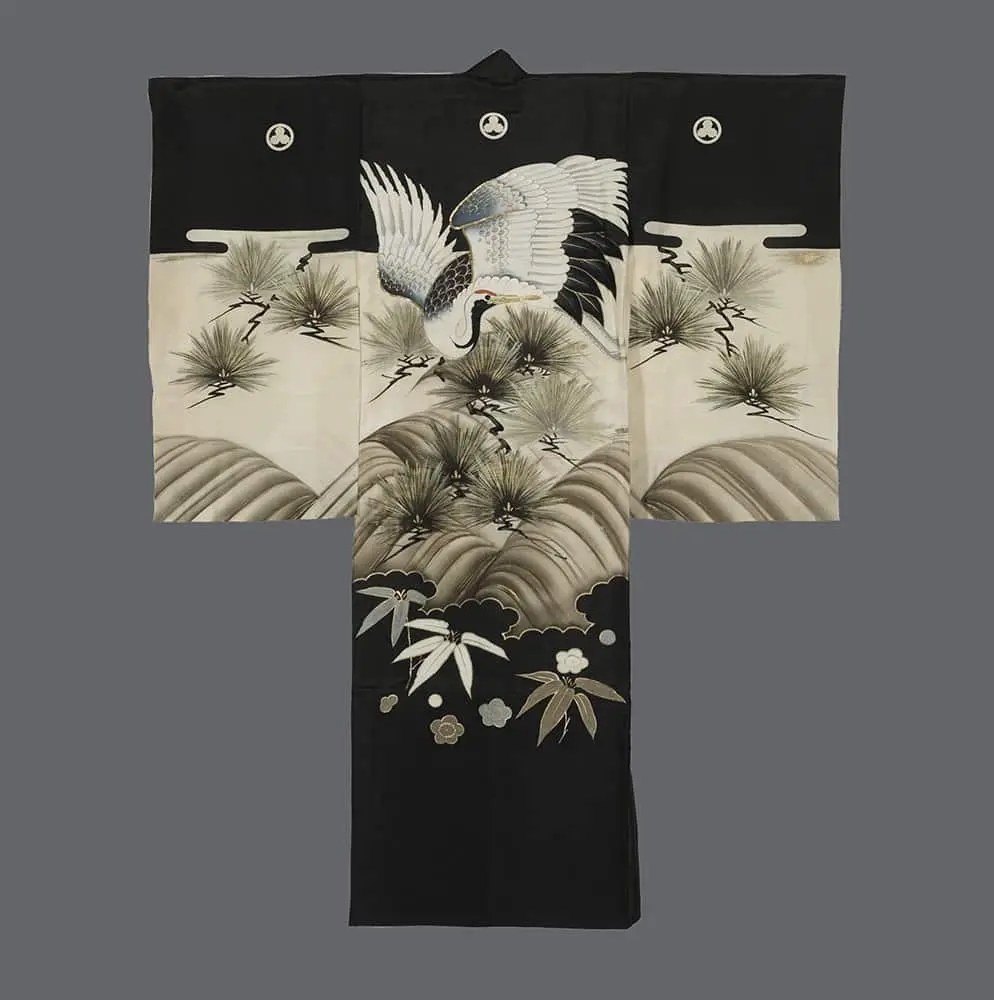 This boy's silk miyamairi kimono, designed for a ceremonial Shinto shrine blessing, showcases a crane perched on a pine tree as its main motif. The design is crafted using painting, gold foil embroidery, and couching techniques. Despite minor imperfections, it remains in very good condition, measuring 33 inches (84 cm) from sleeve-end to sleeve-end and standing at 41 inches (104 cm) in height.