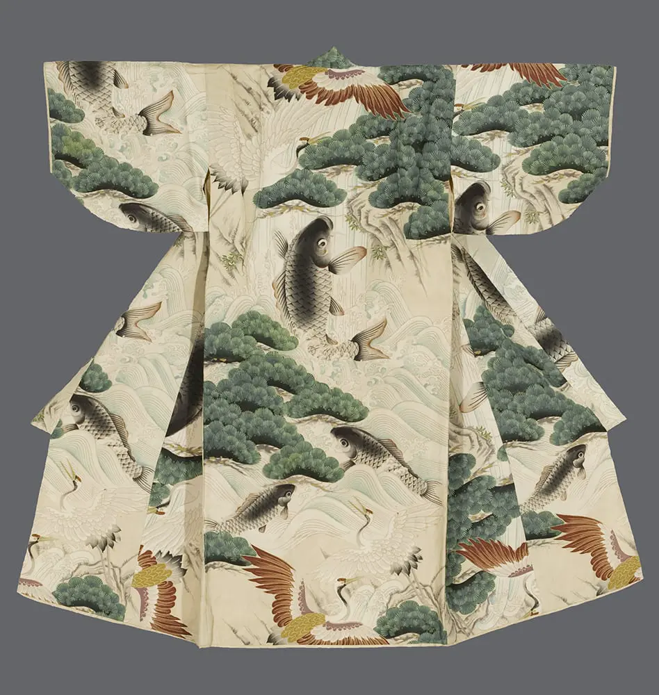This small, fine silk boy's kimono displays silkscreen images of carp and pines. It's in very good condition with only minor imperfections, measuring 23 inches (58 cm) from sleeve-end to sleeve-end and standing at a height of 31 inches (79 cm).