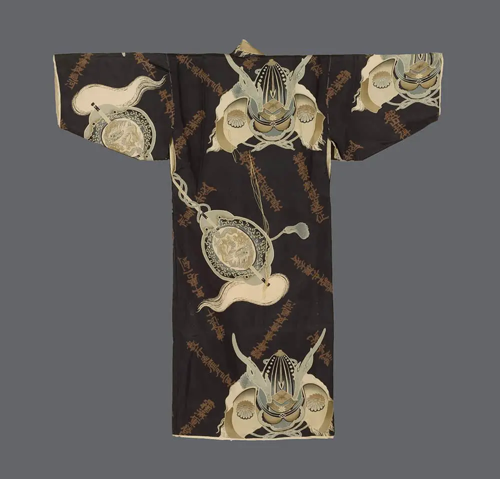 The textile's design vocabulary shows how traditional Japanese decorative arts adapted to modernist sensibilities during this era, combining ancient warrior symbolism with contemporary graphic design principles.