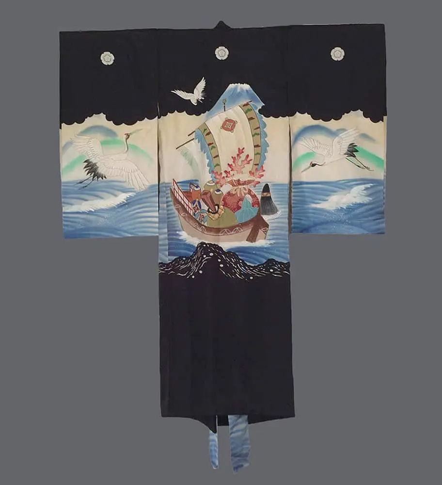This boy's miyamairi (Shinto christening) silk kimono portrays ships carrying traditional treasures like a wish-granting mallet, a bottomless purse, a cape of invisibility, coral, and a rhinoceros horn—all symbols of good fortune. It's in very good condition, measuring 31 inches (79 cm) from sleeve-end to sleeve-end and standing at 39 inches (99 cm) tall.