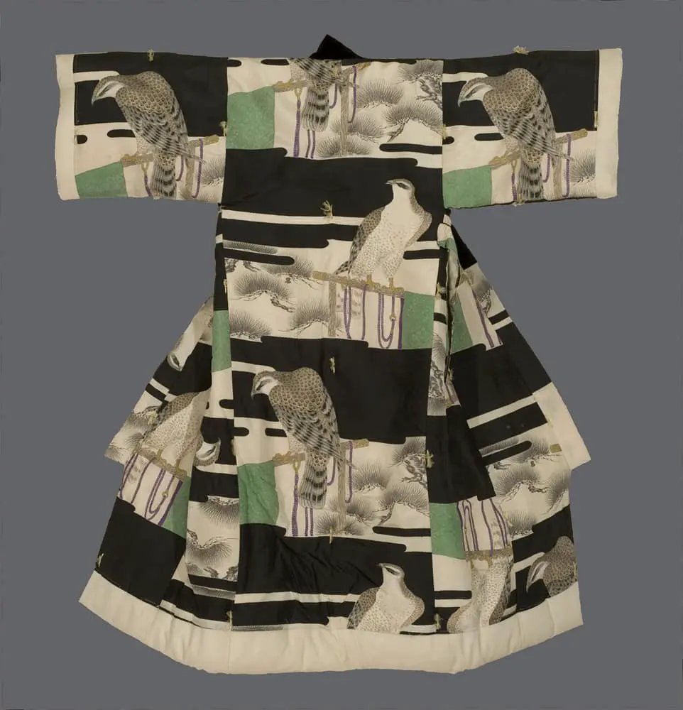 Symbolically, the tethered falcons carry deep cultural significance in Japanese warrior tradition, representing controlled power, noble bearing, and the disciplined mastery of natural forces—qualities deemed essential for young samurai in training. The fragmented presentation of these motifs within geometric frames may suggest the modernizing tensions of the Meiji and Taishō periods, when traditional values were being reconsidered within rapidly changing social contexts. The overall effect creates a garment that functions as both protective ceremonial dress and artistic statement, bridging classical symbolism with avant-garde visual innovation.