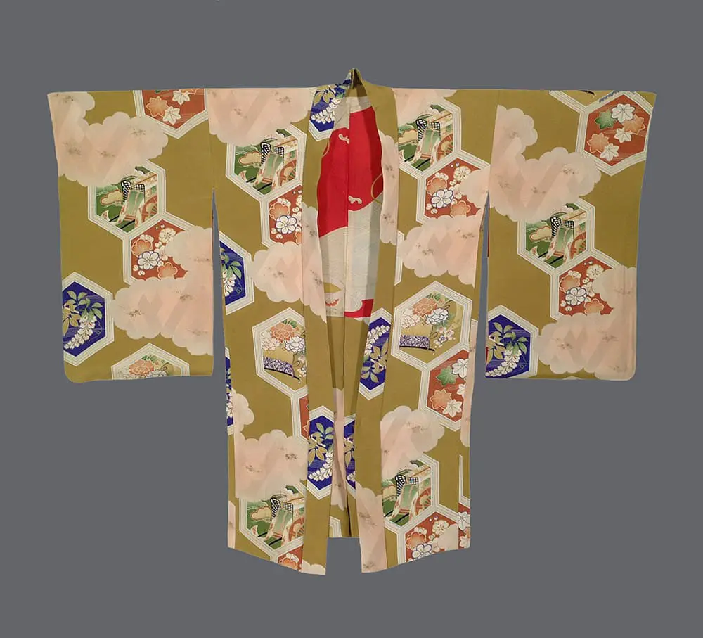 This chirimen (crepe-silk) jacket utilizes an energetic palette and geometric structure to create a modern botanical narrative. The garment is rendered on a bright olive-green silk ground, which provides a lush architectural field for its rhythmic composition.