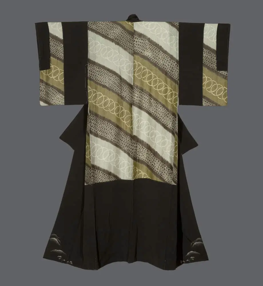The fine silk dounuki, worn as an under-kimono beneath a kurotomesode, features a striking use of shibori-dyed patterning. Broad diagonal bands alternate across the garment, filled with contrasting textures and motifs: looping circular forms created by stitched-resist techniques, alongside denser, stippled shibori textures. The muted palette of olive, taupe, cream, and black creates a restrained yet sophisticated surface, emphasizing the interplay between precision and organic irregularity—one of the hallmarks of shibori artistry.