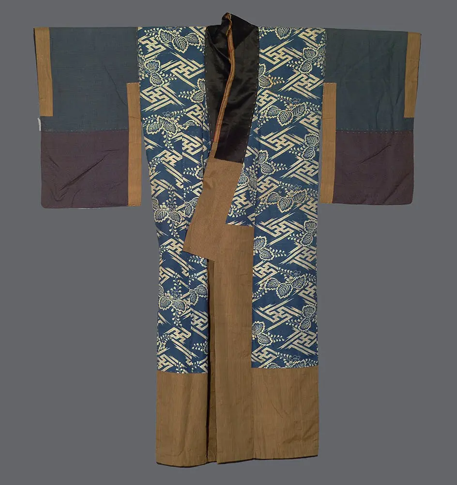 The katazome technique employed here demonstrates exceptional craftsmanship, with crisp, clean lines defining the geometric framework and delicate floral details rendered with remarkable precision. The paulownia blossoms, with their distinctive three-lobed leaves and clustered flower formations, are rendered in elegant stylization that maintains their recognizable characteristics while harmonizing with the overall geometric scheme. The diagonal lattice pattern creates a sense of movement and dimensionality, while the paulownia motifs serve as prestigious ornamental focal points within each diamond-shaped compartment. This combination of geometric structure with the noble paulownia reflects both aesthetic sophistication and social aspiration, as the kiri crest was associated with the highest levels of court and military aristocracy.