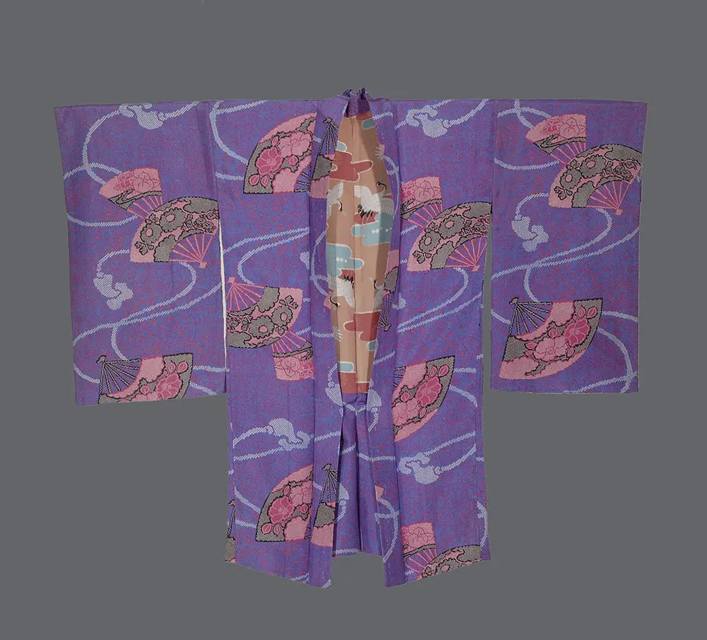 This silk haori is a playful example of textile design, utilizing the era's sophisticated printing techniques to emulate labor-intensive traditional crafts. The garment is rendered on a vibrant periwinkle-blue silk ground, providing a cool, architectural field for its rhythmic botanical and geometric composition.