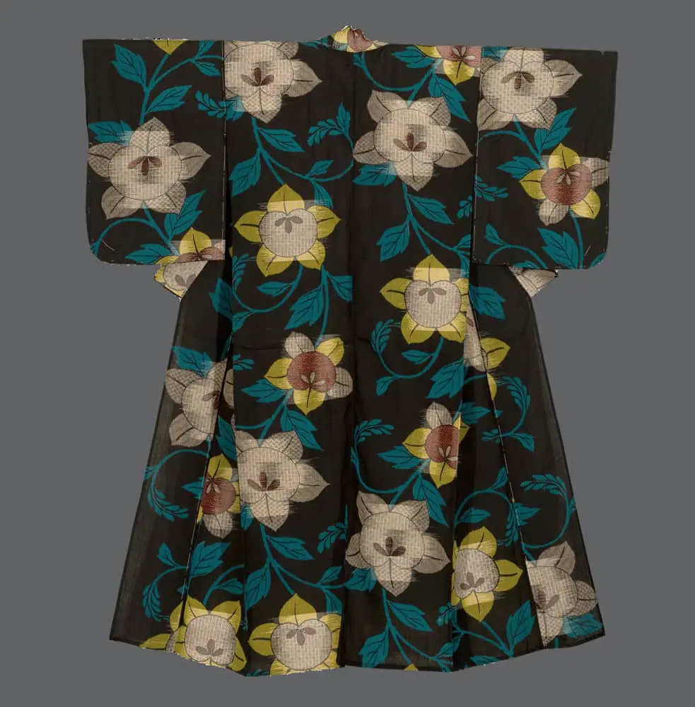 The artistic style and production technique are characteristic of meisen textiles. The design itself, with its large-scale, graphic flowers and scrolling vines set against a dark background, is indicative of the period's artistic trends. The vibrant color palette—featuring bright yellows, teals, and touches of red—was made possible by the use of synthetic dyes, which allowed for a much broader and more brilliant range of colors than traditional plant-based dyes. The overall effect is a dynamic fusion of a traditional Japanese symbol with a distinctly modern, almost Western Art Deco-influenced graphic style, perfectly capturing the spirit of a Japan that was embracing modernity while still holding onto its rich cultural heritage.
