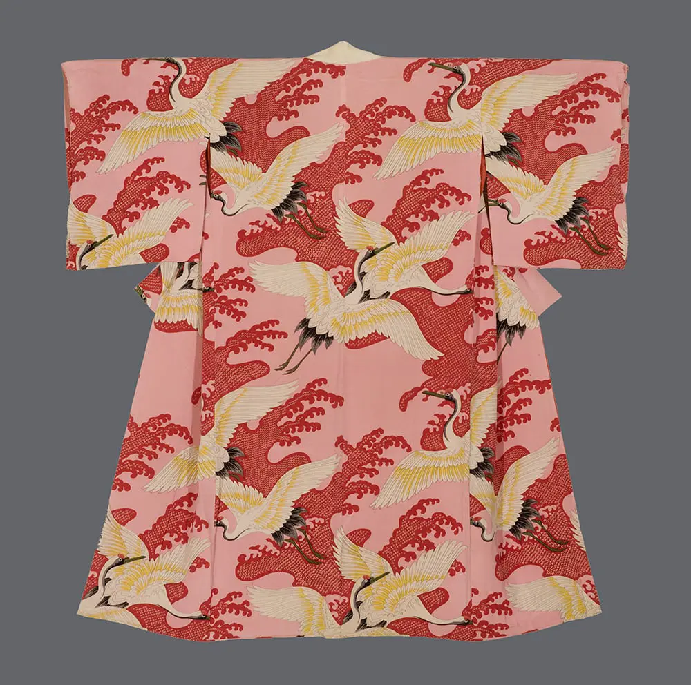This chirimen silk juban possesses a soft pink ground, providing a delicate backdrop for the dynamic composition of soaring cranes rendered in cream and gold with distinctive black wing tips, their forms created through the relatively new silkscreening process that allowed for more affordable yet sophisticated textile production during this era. The stylized waves, depicted in bold red with characteristic foam crests, create a rhythmic pattern that suggests both the rolling motion of the sea and the decorative seigaiha (blue ocean waves) motif that has adorned Japanese art for centuries.