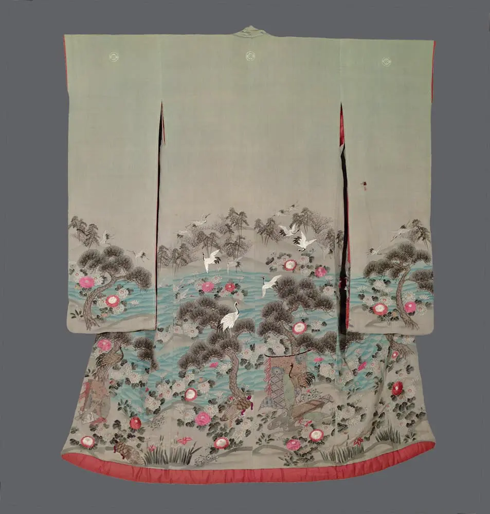The botanical elements include scattered pine needles and branches, chrysanthemums in vibrant coral and soft pink tones, and what appear to be cherry blossoms, all executed with varying techniques that create rich textural contrast. The inclusion of tortoise motifs, though more subtly integrated into the overall pattern, completes a triumphant collection of symbols representing longevity, good fortune, and marital happiness - appropriate for this bridal garment. The artistic approach reflects the influence of classical yamato-e painting traditions while incorporating the refined color sensibilities of the Edo period's mature aesthetic. The sophisticated interplay of sumi-e ink painting with elaborate sagara and three-dimensional metallic embroidery demonstrates the period's technical virtuosity, creating a garment that functions as both ceremonial dress and wearable artistic statement celebrating nature's eternal cycles and life's most auspicious moments.