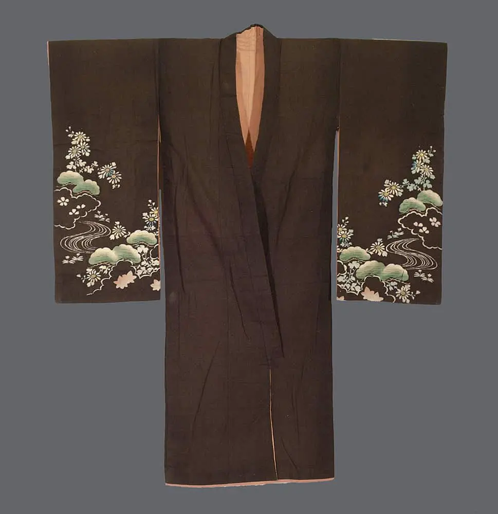 This girl's kimono represents a fascinating example of the era's commercial textile production and the democratization of decorative clothing during Japan's rapid industrialization. The garment is crafted from substantial cotton fabric in a rich chocolate brown that provides an elegant backdrop for the delicate floral, stream, and pine tree motifs rendered in soft greens and whites. The design demonstrates the period's sophisticated understanding of asymmetrical composition, with the decorative elements concentrated on the lower portions and sleeves, creating a sense of movement that suggests water flowing around natural landscapes dotted with seasonal blossoms and evergreen pines.