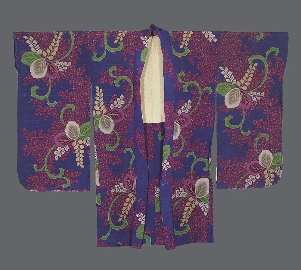The botanical design is rendered in a sophisticated palette of plum-purple, sage-green, and soft ochre-yellow, with the clusters of flowers and heart-shaped leaves appearing to float across a dense, all-over field of tiny reddish-brown blossoms. The sweeping, curling stems add a sense of fluid movement to the garment, while the high-contrast colors reflect the bold graphic sensibilities of the late 1920s and 1930s. This piece represents a period where classical motifs were reimagined with a modern sense of scale and color saturation, resulting in a garment that is both physically delicate and visually powerful.
