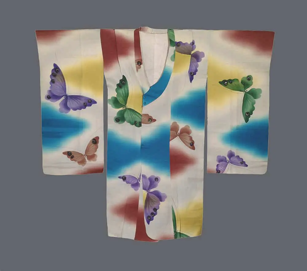 The primary composition features a series of large-scale butterfly motifs that appear to flutter across the body and sleeves. These butterflies are rendered through a combination of bold silkscreening and hand-painting, utilizing a saturated palette of violet, emerald green, and russet brown. The background is equally energetic, featuring abstract, airbrushed clouds of cerulean blue, golden yellow, and deep crimson that create a sense of atmospheric depth. This piece reflects the era's talent for blending nostalgic auspicious symbols with a daring, modern sense of scale and color.