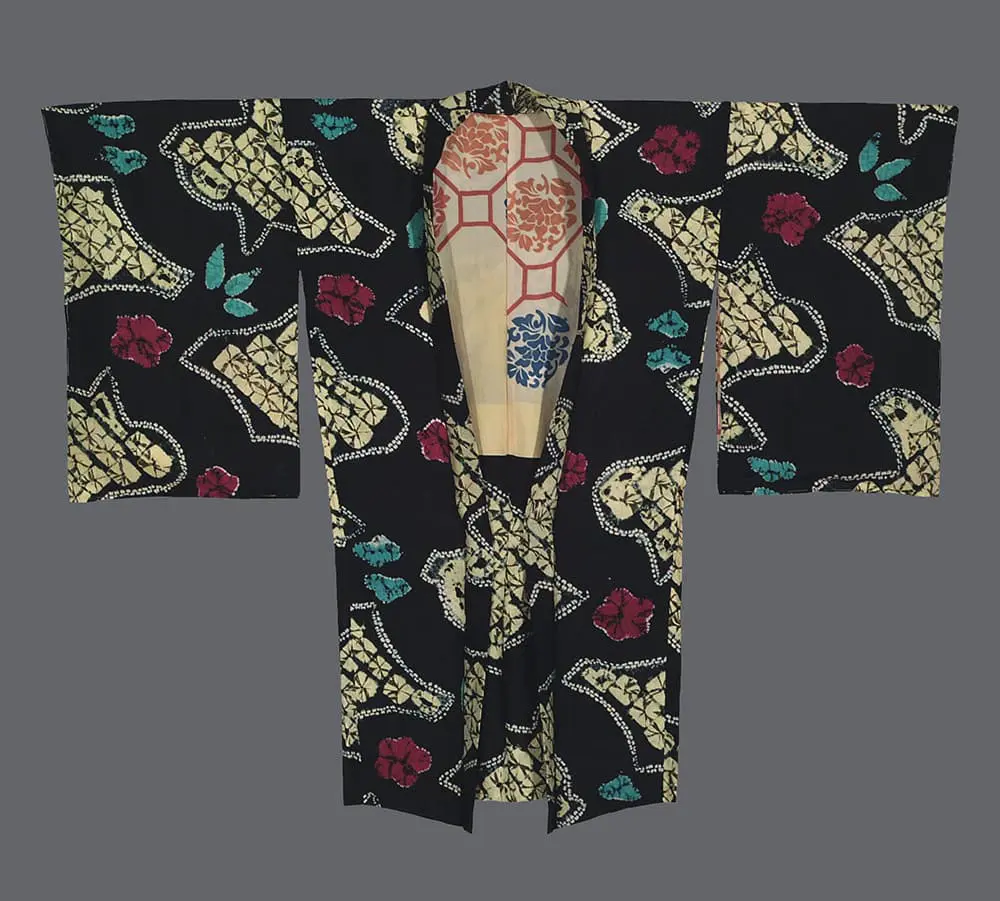 The composition reflects the Japanese aesthetic principle of ma (negative space), where the dramatic black ground serves not merely as background but as an active compositional element that gives the patterned areas their visual weight and meaning. The scattered red motifs and touches of turquoise green create rhythmic color accents that prevent the strong yellow-and-black contrast from becoming too stark, demonstrating the Japanese sensitivity to color harmony and visual balance. This approach to design shows influences from both traditional Japanese textile arts and mid-century modern aesthetics, particularly in its bold scale and confident use of negative space. The technical execution represents shibori at its most refined, where the resist-dyed patterns achieve an almost architectural precision while maintaining the organic irregularities that make each motif unique. The overall effect suggests both traditional Japanese cloud patterns (kumo) found in classical art and the abstract expressionist sensibilities that were influencing Japanese design during this period of cultural exchange and modernization.