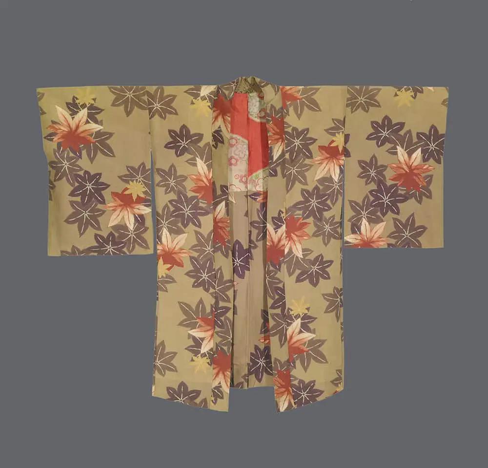 This chirimen-silk jacket is a beautiful celebration of seasonal transition, utilizing the expressive potential of silk-screen printing to create a lush, all-over botanical composition. The garment is rendered on a warm, sandy-ochre silk ground, providing a serene architectural field for the rhythmic placement of its foliage.
