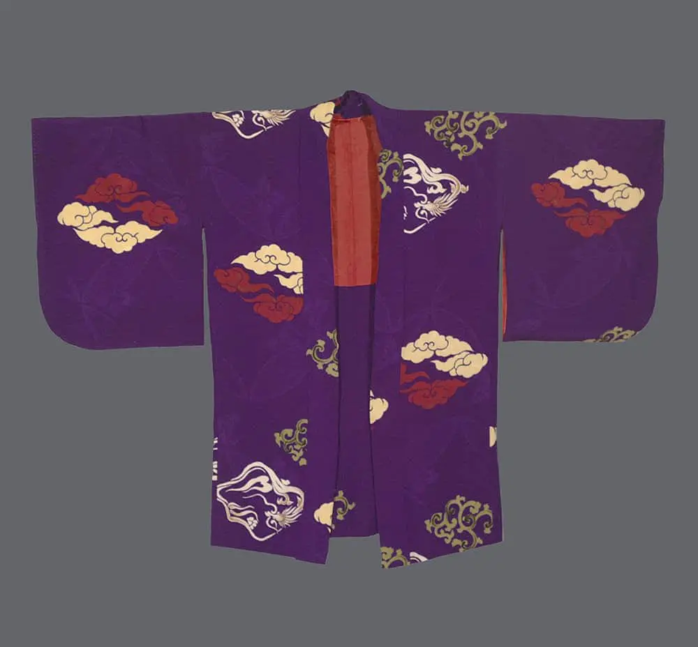 This silk rinzu jacket is a visually arresting example of mid-century textile design, featuring bold and energetic surface decoration. The garment is rendered in a deep purple silk, which serves as a rich architectural field for its rhythmic composition of katazome cloud patterns.