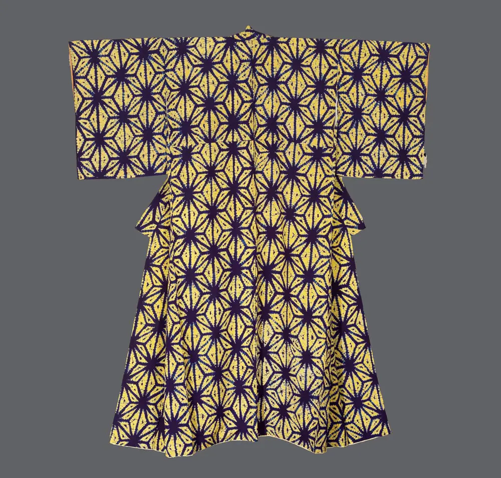 Aesthetically, this kimono reflects the period's appreciation for bold, graphic design elements that would later influence modernist movements. The high contrast between the golden silk and indigo dye creates a striking visual impact that recalls both traditional Japanese woodblock prints and emerging Art Deco sensibilities of the era. The asanoha's geometric precision and infinite repeatability across the fabric surface demonstrates how traditional Japanese pattern-making anticipated many principles that would become central to 20th-century design philosophy, bridging ancient craft traditions with modern aesthetic sensibilities.