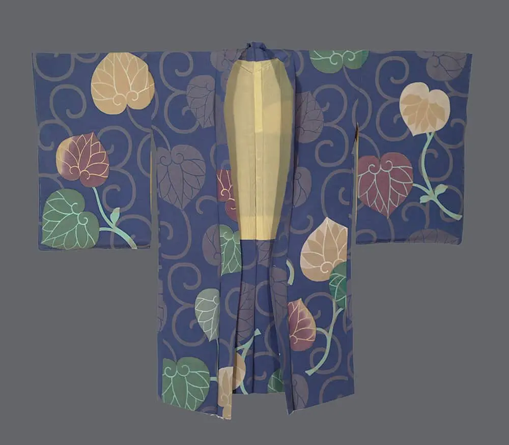 Elegant fusion of Japanese textile artistry appears in this piece, featuring hollyhock leaf motifs and curling vines against a deep navy background. The design demonstrates a sophisticated interplay between freehand painting and weaving techniques that creates a multi-layered visual effect. The composition shows remarkable affinity with Art Nouveau's fascination with organic, flowing forms, though it emerges from an earlier Japanese design tradition. The color palette is particularly refined, with hollyhock leaves rendered in varying shades of burgundy, golden yellow, and spring green against the rich navy ground. The leaves are outlined with delicate white lines that add definition and luminosity to each form. The curling vines, executed in a silvery gray, create a rhythmic pattern of scrolling arabesques that weave throughout the composition, adding a sense of movement and sophisticated complexity to the design. The arrangement of elements shows the characteristic Japanese appreciation for asymmetrical balance, with the hollyhock leaves scattered in a seemingly random yet carefully orchestrated pattern. The way the design incorporates negative space through the deep navy background demonstrates the Japanese concept of "ma"(間), while the rhythmic placement of the scrolling vines creates a sense of continuous movement that is a hallmark of Art Nouveau design. The technical execution is particularly noteworthy, as it combines the fluid, organic qualities of painted elements with the precise, structural aspects of the woven patterns. This integration creates a sophisticated layering effect that adds both visual and textural depth to the garment.