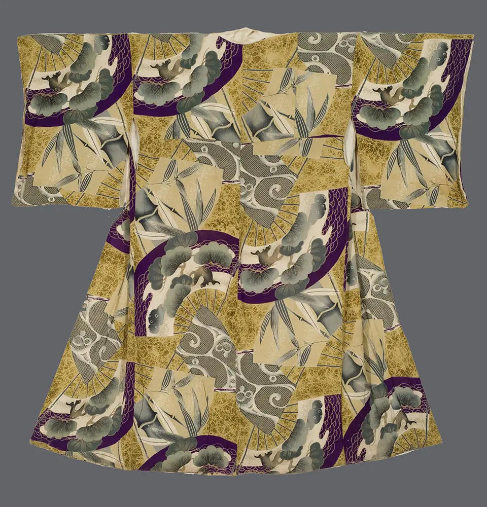 The color palette of rich gold, deep purple, and muted gray-greens demonstrates the sophisticated taste of the urban elite during Japan's rapid modernization period. The faux-batik background technique is particularly noteworthy, as it shows how Japanese textile manufacturers were experimenting with reproducing the visual effects of traditional Indonesian resist-dyeing methods through silk-screening, creating a cosmopolitan aesthetic that reflected Japan's increasing engagement with international design influences. As an undergarment, this juban would have been a private display of luxury and refinement, allowing the wearer to enjoy elaborate artistry in an intimate setting while maintaining the more restrained exterior appearance expected in public.