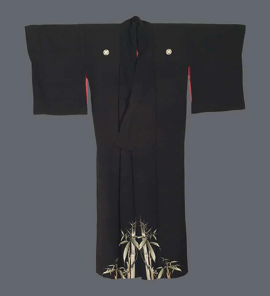 The bamboo motif is a deeply auspicious symbol in Japan, representing strength, flexibility, and resilience as it bends but does not break. In the context of a kurotomesode—the most formal attire for married women—the inclusion of bamboo reflects a wish for a steadfast and enduring family life. The placement of the design only along the hem is characteristic of this garment type, intended to be seen as the wearer moves, while the kasane layering adds a significant level of prestige and traditional formality to the ensemble.