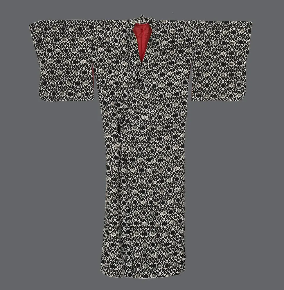 The black-and-white palette represents timeless elegance in Japanese textile tradition, suitable for various occasions and ages. Such geometric patterns carry no specific seasonal associations, making the garment versatile for year-round wear. The overall effect balances the organic beauty of floral forms with the ordered precision of geometric structure—a synthesis characteristic of refined Japanese decorative arts.