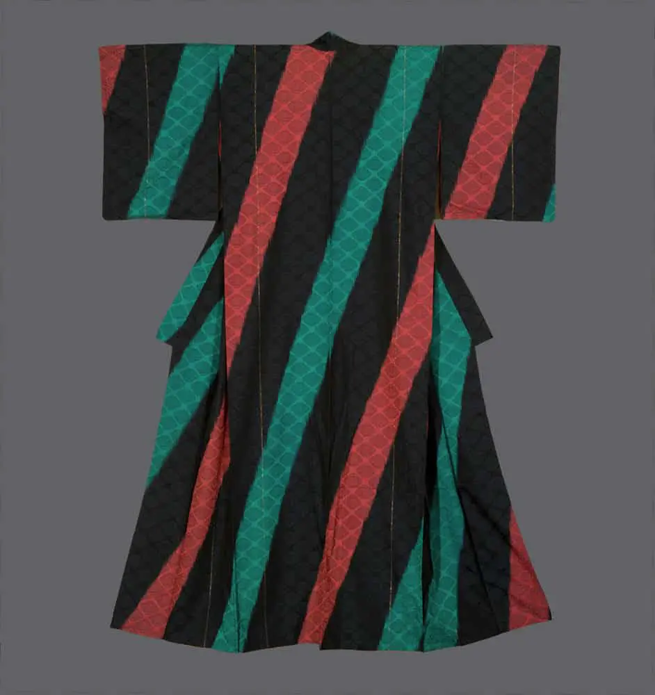 This silk kimono demonstrates the bold aesthetic experimentation that characterized Japanese textile design during the early Shōwa period. Executed on a luxurious rinzu silk base and advanced silkscreen techniques, the garment features a dramatically simple yet powerful composition of diagonal stripes in vibrant coral-red and emerald green that cut dynamically across a deep black ground. The detail image reveals the sophisticated technical execution, showing how each colored stripe is overlaid with subtle geometric patterning that adds textural depth and visual interest to what might otherwise be a purely minimalist design.