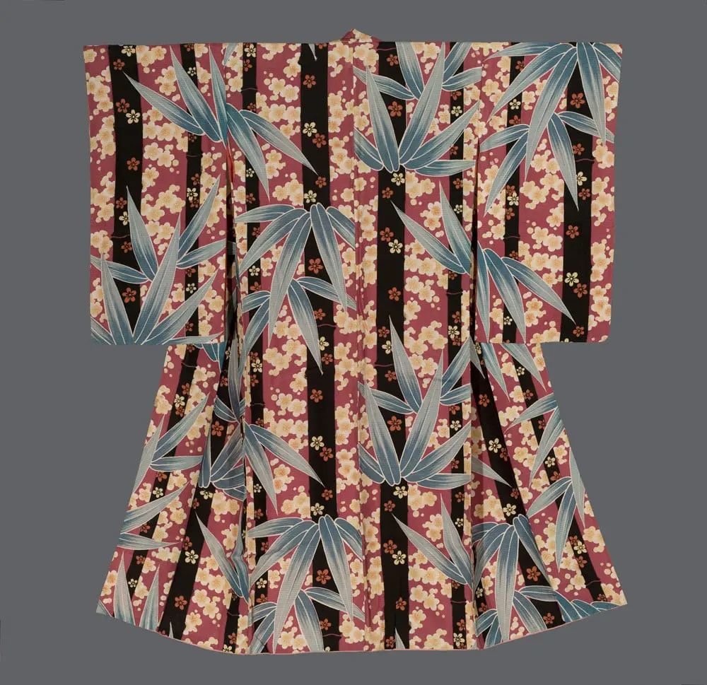 This rayon kimono features bold vertical stripes in deep burgundy and black that create a rhythmic framework across the garment, reminiscent of Art Deco's emphasis on linear patterns and geometric structure, while delicate ume (plum) blossoms in cream and pale yellow float across these bands like scattered confetti. The silkscreened bamboo leaves, rendered in elegant blue-gray tones with precise linear detailing, cut dynamically across the striped ground, creating visual tension between the vertical structure and the organic diagonal movement of the bamboo stalks.