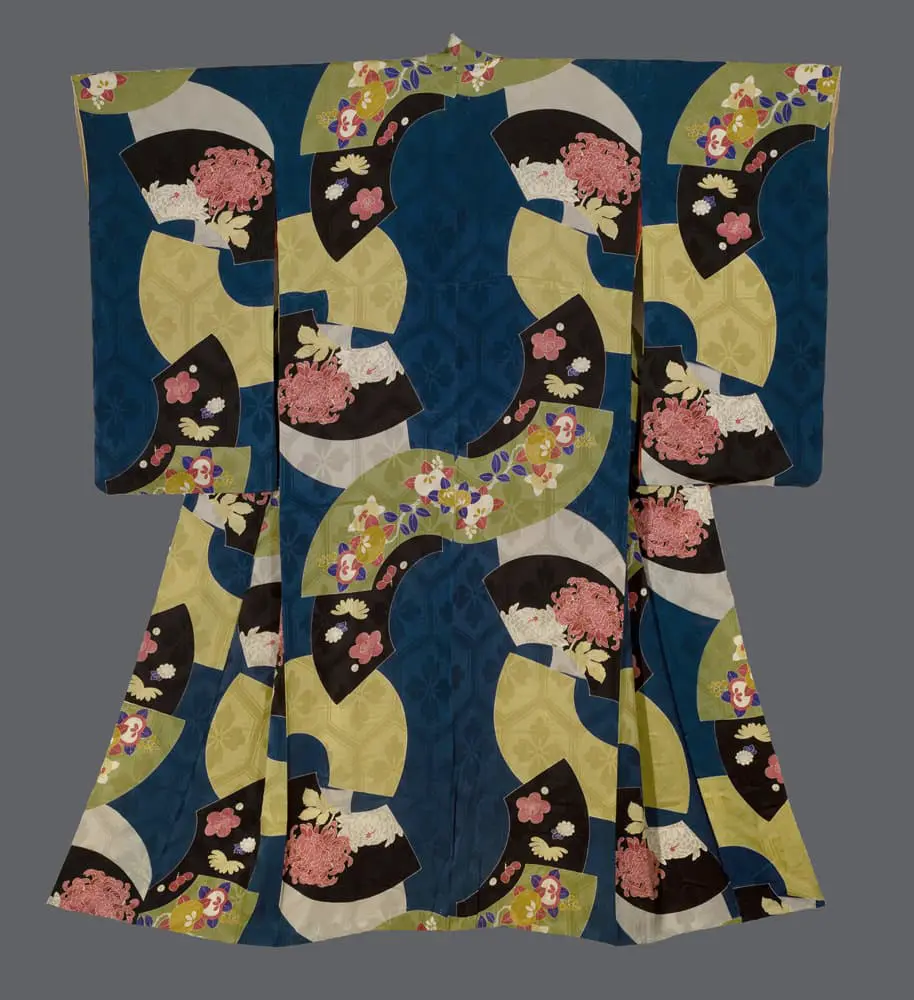 This rinzu silk kimono features an intricate composition of overlapping fan (sensu) motifs rendered through silkscreen printing, creating a dynamic visual rhythm across the textile surface. The fans are depicted in contrasting color blocks of deep navy blue, chartreuse yellow, cream white, and rich black, with each fan containing carefully orchestrated floral arrangements including chrysanthemums, cherry blossoms, and other seasonal flowers rendered in pink, coral, and white tones. The fan motif carries deep cultural significance in Japanese aesthetics, traditionally symbolizing prosperity, good fortune, and the unfolding of life's possibilities - themes that resonated powerfully during the Taisho period's atmosphere of cultural expansion and modernization. The overlapping arrangement creates complex spatial relationships that echo contemporary developments in Cubist and Futurist art, while the bold color contrasts reflect the influence of European avant-garde movements. The detail images reveal the sophisticated integration of geometric fan shapes with naturalistic floral elements, where chrysanthemums and other blooms are precisely positioned within the fan segments, creating intimate pictorial vignettes that maintain the classical Japanese tradition of seasonal flower appreciation. The technical execution demonstrates the period's embrace of industrial printing methods while preserving traditional aesthetic values. The rinzu silk's damask weave creates subtle textural variations that enhance the visual complexity, while the silkscreen technique allows for the precise registration of multiple colors and the crisp definition of both geometric and organic forms.