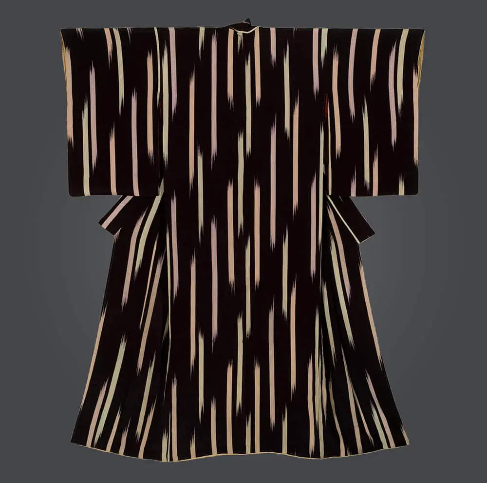 The stenciling or silk-screening technique allows for this unique combination of precision and spontaneity - the overall stripe structure is controlled while the irregular edges suggest natural processes like erosion, melting, or organic growth. This kimono demonstrates how Japanese textile artists were exploring the expressive potential of industrial processes decades before similar investigations appeared in Western contemporary art.