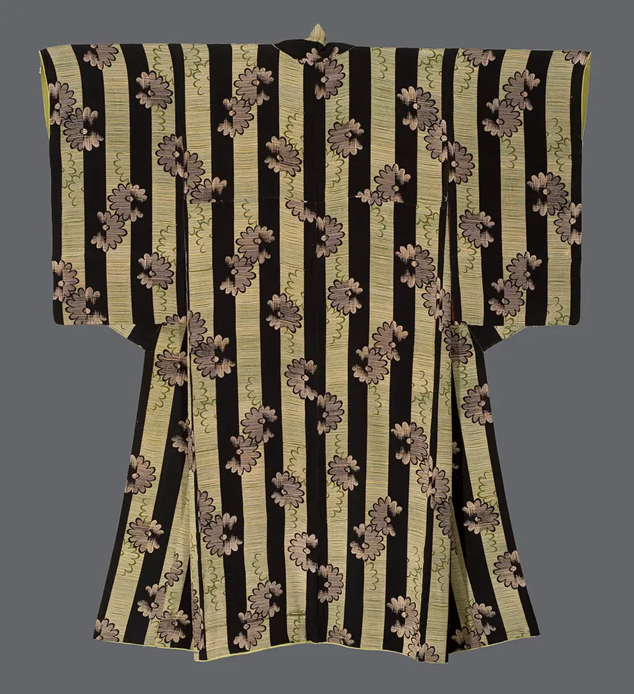 This chirimen silk kimono features bold black vertical stripes alternating with golden yellow bands, creating a strong linear framework. Against this structured background, stylized chrysanthemum-like flowers in muted lavender tones appear to float across the surface, their placement seemingly random yet carefully balanced to create visual rhythm and movement.