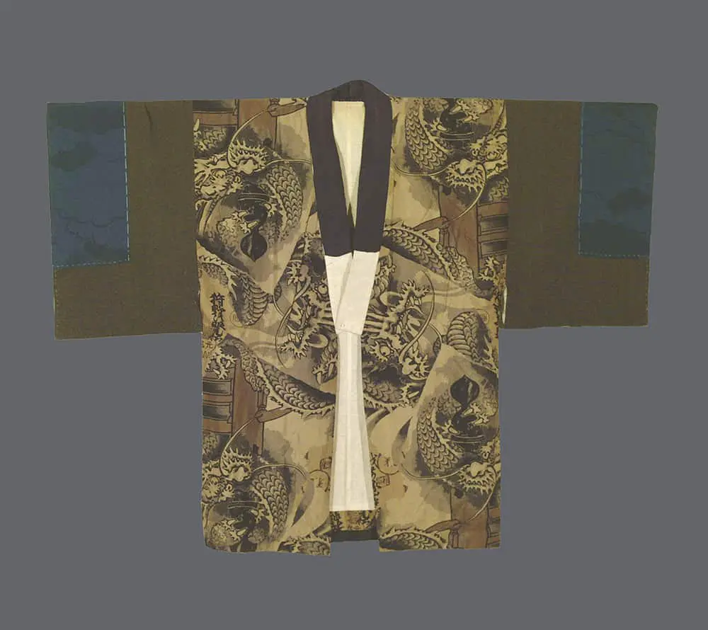 The dragon motif carries profound symbolic weight in East Asian culture, representing imperial power, wisdom, strength, and the ability to bring rain and prosperity - making it particularly appropriate for men's garments of this era when Japan was asserting itself as a modern imperial power. The artistic execution reflects the influence of traditional ink painting traditions, with the printed design mimicking the bold brushwork and tonal variations characteristic of sumi-e painting techniques. This period marked a fascinating intersection between Japan's opening to Western influence and a renewed appreciation for indigenous artistic traditions, evident in how this garment maintains classical dragon iconography while employing modern textile printing methods.