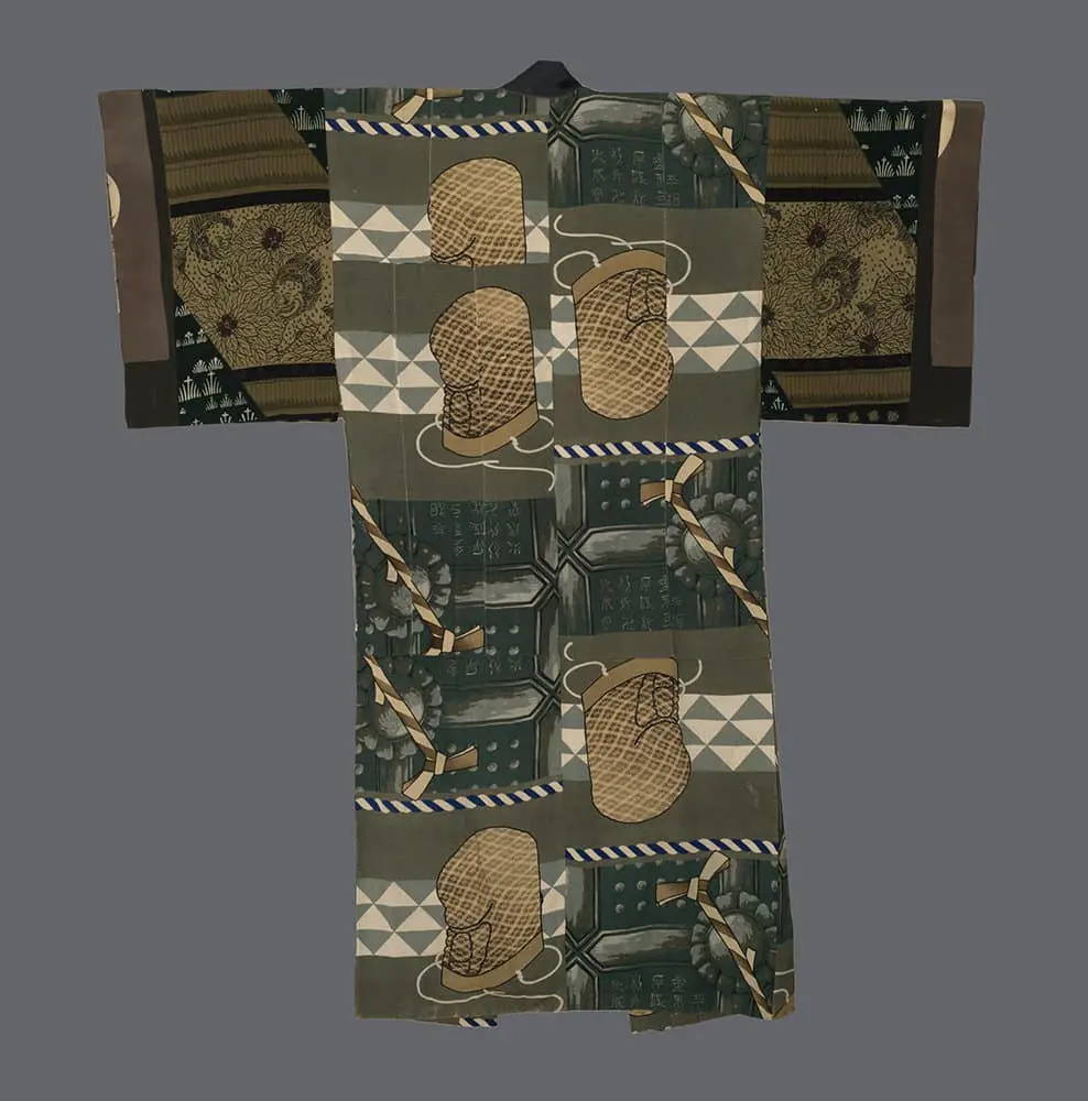 The symbolism layers multiple meanings - the eboshi caps traditionally worn by court nobles suggest refinement and cultural sophistication, while the armor pieces invoke the bushido ideals of protection, duty, and martial prowess. Together, they may represent the dual nature of Japanese masculine identity, encompassing both intellectual cultivation and warrior strength. The unusual nine-panel construction of the back section further emphasizes the garment's experimental nature, suggesting a departure from conventional tailoring that mirrors the progressive artistic treatment of its surface decoration.