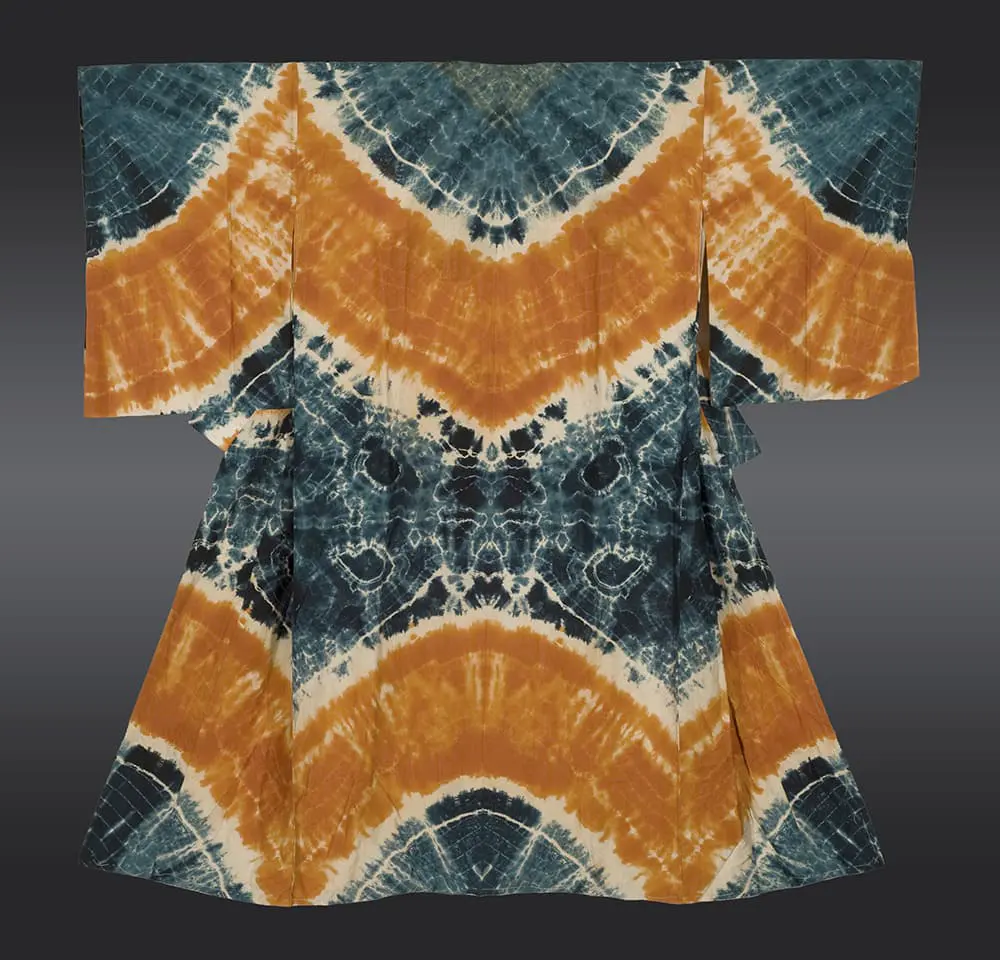 This remarkable silk juban displays an extraordinary interpretation of mino shibori, a specialized form of tie-dyeing that deliberately evokes the layered, protective qualities of traditional mino straw raincoats worn by farmers and travelers in rural Japan. The design creates a powerful visual metaphor, transforming an undergarment into a canvas that celebrates the practical wisdom and aesthetic beauty of vernacular Japanese material culture.