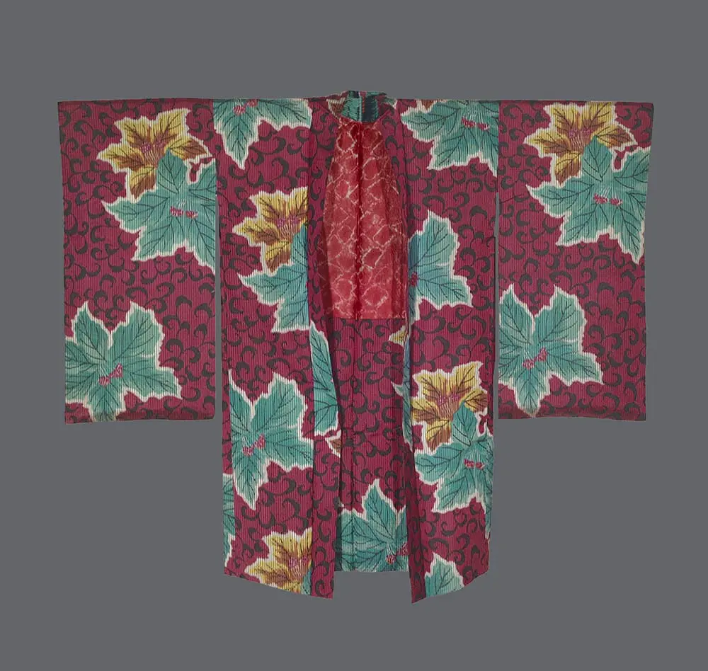 Large maple leaves rendered in turquoise blue and golden yellow against a deep burgundy background filled with traditional karakusa (arabesque) scrollwork distinguish this piece. The design reflects clear aesthetic parallels with both traditional Japanese textile patterns and the Art Nouveau movement in the West. The bold, organic maple leaf motifs and their flowing arrangement reflect the Japanese artistic principle of shizen (naturalness), while their stylized execution and the rhythmic placement across the fabric aligns with Art Nouveau's embrace of natural forms and curved lines. The color palette is particularly noteworthy - the combination of turquoise blue with warm burgundy creates a sophisticated contrast typical of Japanese textile design, while the addition of golden yellow leaves adds visual accent. The karakusa pattern in the background, a classic element of Japanese design dating back to the Heian period, creates a complex layered effect that predates but resonates with Art Nouveau's interest in intricate, nature-inspired patterns.