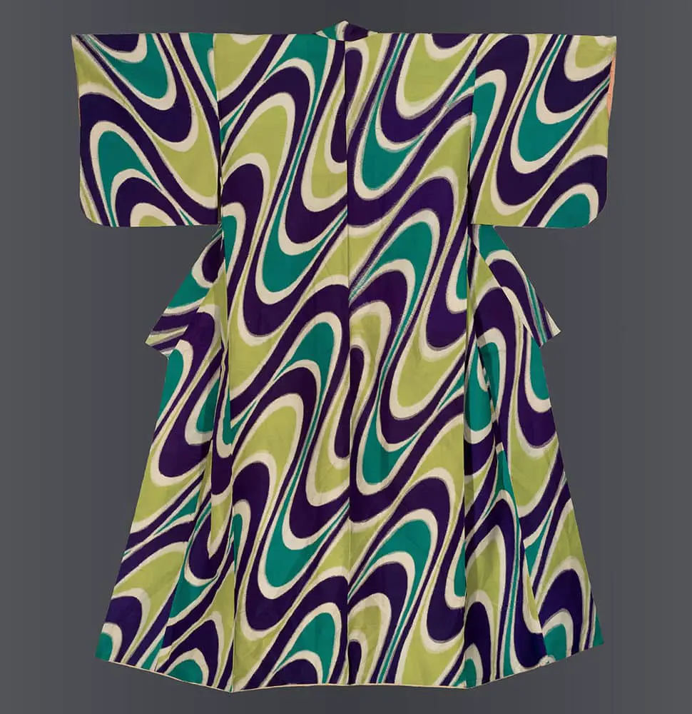 This striking meisen silk kimono displays a bold, psychedelic marbleized pattern that bridges traditional Japanese textile techniques with the emerging aesthetics of mid-century modernism. The swirling, organic waves of deep purple, teal, chartreuse, and cream create a dynamic sense of movement across the fabric, reminiscent of both natural phenomena like flowing water or geological strata and the experimental visual language that would come to define the approaching Pop Art and psychedelic art movements of the 1960s.