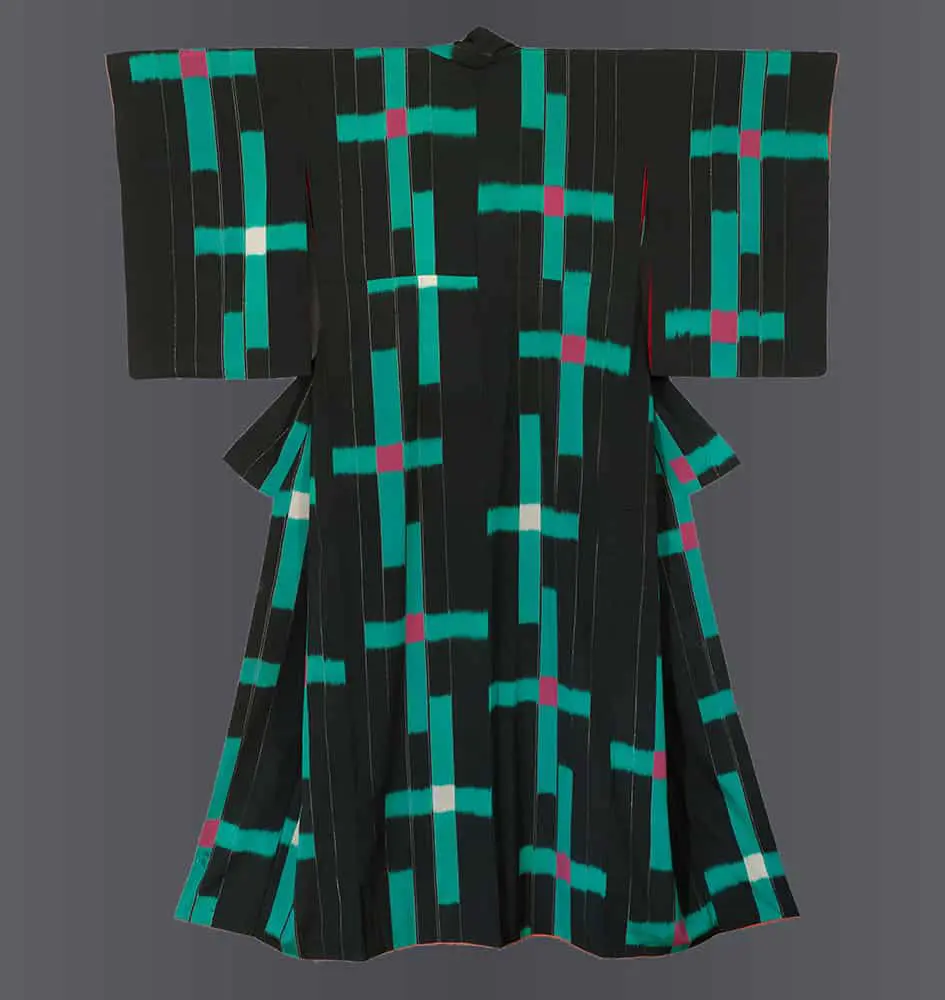 The garment is a striking example of Omeshi silk, a high-status textile traditionally valued for its rich, heavy drape and crepe-like texture. However, the design is a radical departure from tradition, functioning as a wearable manifesto of Constructivism and Art Deco.