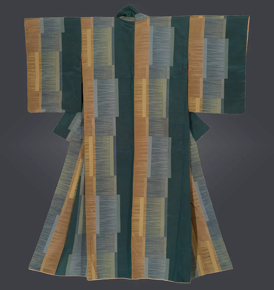 This kimono represents a fascinating cultural moment when Japanese textile artisans were adapting traditional garment forms to incorporate modernist design principles. The bold use of color blocking and geometric repetition reflects the influence of international design movements while maintaining the essential structure and proportions of classical Japanese dress. The vertical emphasis of the striped pattern would have been particularly flattering when worn, creating an elongated silhouette that exemplifies the marriage of aesthetic innovation with functional beauty.