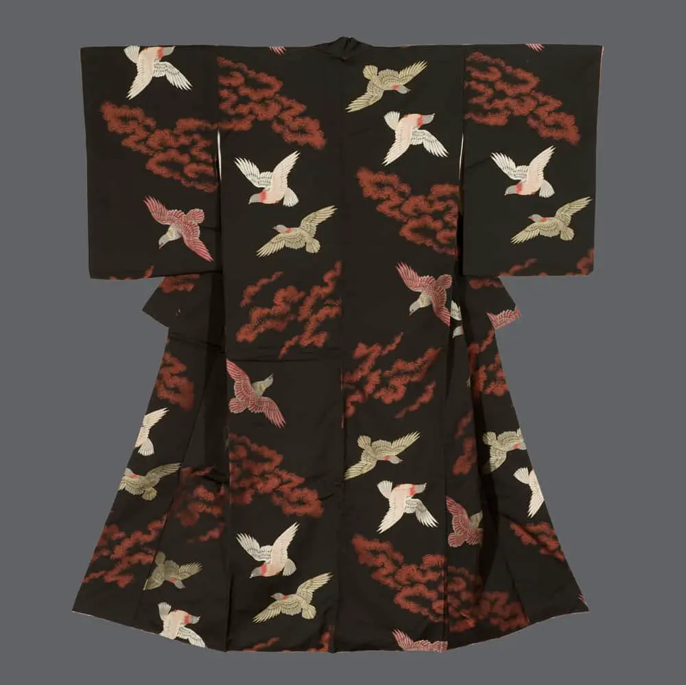 The artistic treatment reflects the influence of both traditional Japanese textile arts and the period's experimentation with new production methods during Japan's post-war reconstruction era. The birds, while maintaining classical proportions and graceful poses reminiscent of earlier nihonga painting traditions, are executed with a more stylized, almost geometric precision that speaks to mid-century design sensibilities. The mysterious rust-colored motifs—whether representing clouds, abstract landscape elements, or purely decorative forms—demonstrate the period's willingness to blend representational and non-representational elements within traditional garment structures.