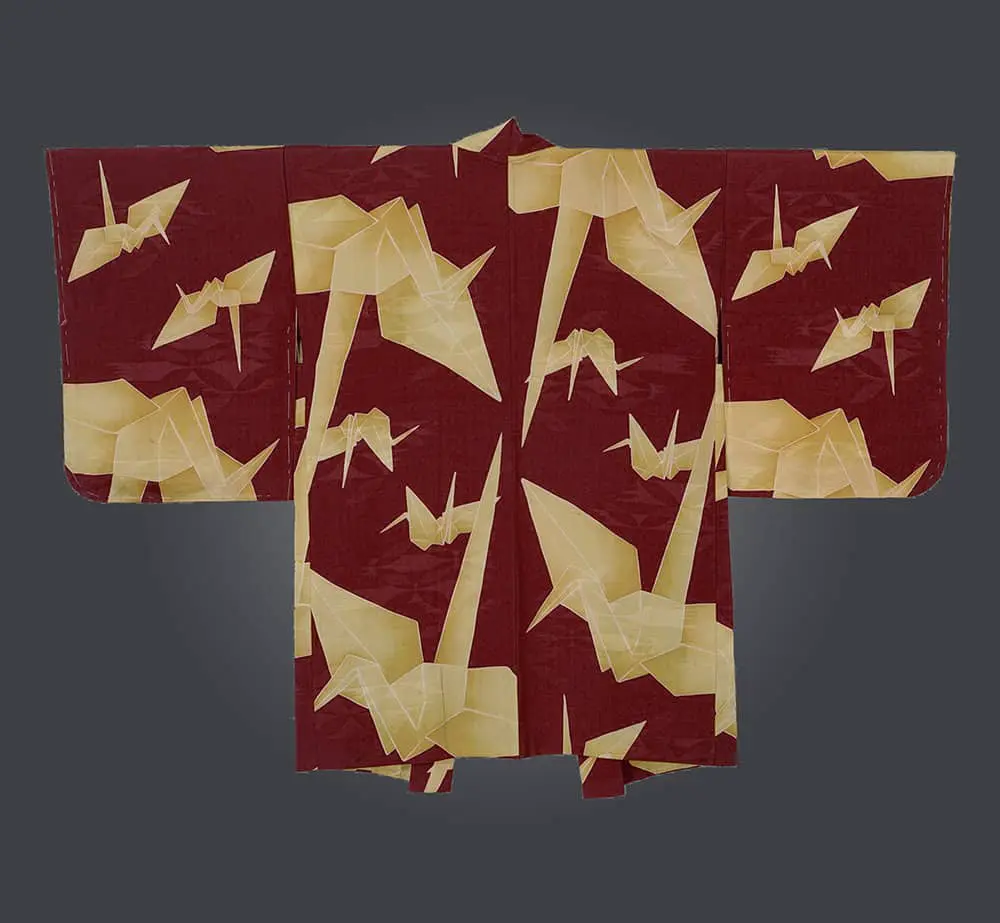 This haori presents a striking and modern aesthetic through its bold use of a single, repeated motif: the origami crane. The stark contrast between the rich burgundy ground and the stylized, almost geometric forms of the cream-colored cranes creates a visually arresting pattern. This repetition and the crane's angular shapes evoke a sense of dynamism and movement, reminiscent of Op Art, with its focus on optical illusions and geometric patterns. However, unlike the often abstract nature of Op Art, the haori retains a clear connection to a recognizable and culturally significant symbol.