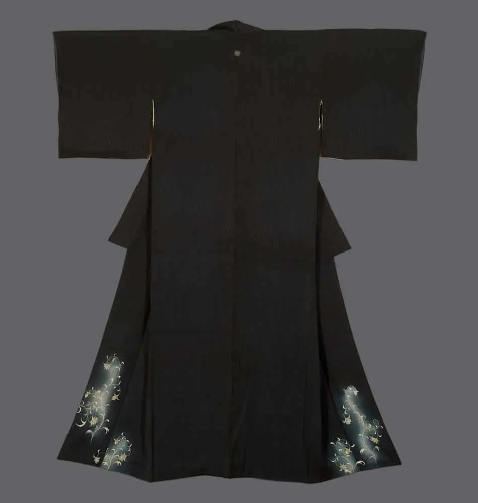 The artistic treatment reflects the influence of naturalistic design movements that were prevalent during the Taisho period, showing a departure from more rigid geometric patterns toward flowing, organic forms that suggest the Art Nouveau movement's impact on Japanese decorative arts. The yuzen technique allows for painterly effects with soft color transitions and delicate line work that creates an almost ethereal quality to the floral elements. The asymmetrical placement of the design, concentrated on the lower hem area, follows traditional Japanese aesthetic principles of space and balance, where empty areas are as important as decorated ones, creating a sophisticated interplay between the lustrous black silk and the subtle metallic accents of the painted flowers.
